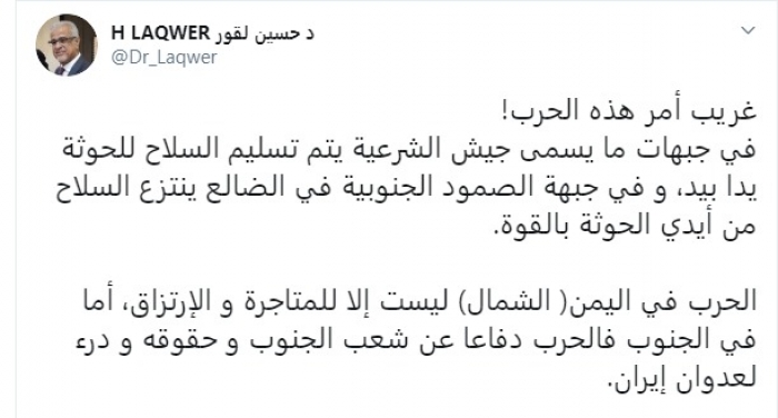 وقال في تغريدة عبر "تويتر" رصدها "المشهد العربي": "غريب أمر هذه الحرب! في جبهات ما يسمى جيش الشرعية يتم تسليم السلاح للحوثة يدا بيد، و في جبهة الصمود الجنوبية في الضالع ينتزع السلاح من أيدي الحوثة بالقوة. الحرب في اليمن(الشمال) ليست إلا للمتاجرة والارتزاق، أما في الجنوب فالحرب دفاعًا عن شعب الجنوب وحقوقه ودرء لعدوان إيران".