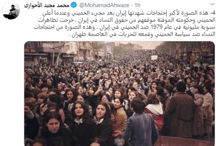 وقال في تغريدة عبر "تويتر" رصدها "المشهد العربي": "هذه الصورة لأكبر احتجاجات شهدتها إيران بعد مجيء الخميني وعندما أعلن الخميني وحكومته الموقتة موقفهم من حقوق النساء في إيران، خرجت تظاهرات نسوية مليونية في عام 1979 ضد الخميني في إيران، وهذه الصورة من احتجاجات النساء ضد سياسة الخميني وقمعه للحريات في العاصمة طهران".