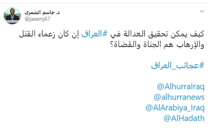 وقال في تغريدة عبر "تويتر" رصدها "المشهد العربي": "كيف يمكن تحقيق العدالة في العراق إن كان زعماء القتل والإرهاب هم الجناة والقضاة".