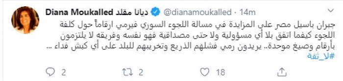 وقالت في تغريدة عبر "تويتر" رصدها "المشهد العربي": "جبران باسيل مصر على المزايدة في مسالة اللجوء السوري فيرمي أرقاماً حول كلفة اللجوء كيفما اتفق بلا أي مسؤولية ولا حتى مصداقية فهو نفسه وفريقه لا يلتزمون بأرقام وصيغ موحدة.. يريدون رمي فشلهم الذريع وتخريبهم للبلد على أي كبش فداء".