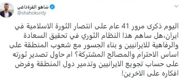 وجه الكاتب الصحفي العراقي شاهو القرةداغي، اليوم، تساؤلات محرجة للنظام الإيراني في الذكري الـ41 لما يسمى بالثورة الإسلامية.