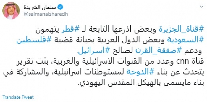 وقال في تغريدة عبر "تويتر" رصدها "المشهد العربي": "قناة الجزيرة وبعض أذرعها التابعة لقطر يتهمون السعودية وبعض الدول العربية بخيانة قضية فلسطين ودعم صفقة القرن لصالح إسرائيل. قناة cnn وعدد من القنوات الإسرائيلية والغربية، بثت تقرير يتحدث عن بناء الدوحة لمستوطنات إسرائيلية، والمشاركة في بناء ما يسمى بالهيكل المقدس اليهودي".