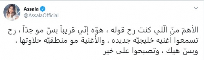 وتابعت :"الأهمّ منّ الّلي كنت رح قوله، هوّه إنّي قريباً بسّ مو جدّاً، رح تسمعوا أغنية خليجيّة جديدة، والأغنية مو منطقيّه حلاوتها، وبسّ هيك، وتصبحوا على خير".