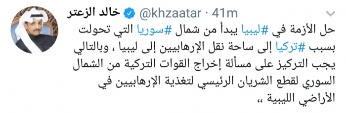 وكتب الزعتر، في تغريدة له على موقع التواصل الاجتماعي تويتر، تابعها المشهد العربي: "حل الأزمة في ليبيا يبدأ من شمال سوريا التي تحولت بسبب تركيا إلى ساحة نقل الإرهابيين إلى ليبيا".