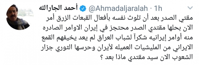 وكتب الجارالله، في تغريدة له على موقع التواصل الاجتماعي تويتر، تابعها المشهد العربي: "مقتدي الصدر بعد أن تلوث نفسه بأفعال القبعات الزرق أمر الآن بحلها".
