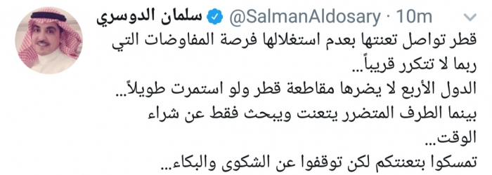 الدوسري لقطر: تمسكوا بتعنتكم لكن توقفوا عن الشكوى والبكاء