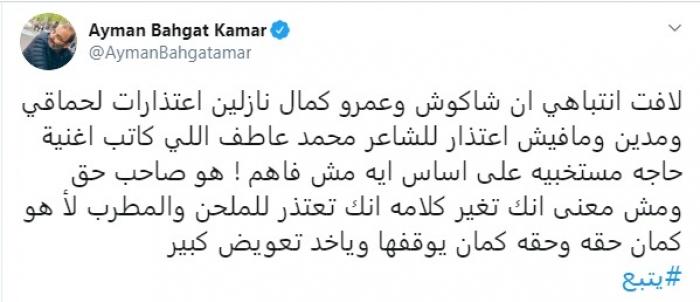 وفاجأ "قمر" جمهوره بتغريدتين، عبر حسابه الرسمي بموقع تويتر: "لفت انتباهي إن شاكوش وعمر كمال نازلين اعتذارات لحماقي ومدين ومافيش اعتذار للشاعر محمد عاطف اللي كاتب أغنية حاجة مستخبية على اساس إيه مش فاهم ، هو صاحب حق ومش معنى إنك تغير كلامه إنك تعتذر للملحن والمطرب لأ هو كمان حقه، وحقه كمان يوقفها وياخد تعويض كبير".