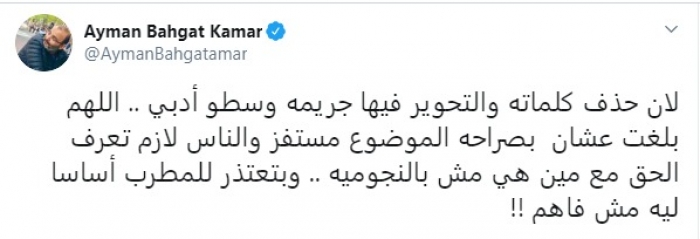 وتابع :" لأن حذف كلماته والتحوير فيها جريمة وسطو أدبي، اللهم بلغت عشان بصراحة الموضوع مستفز والناس لازم تعرف الحق مع مين، هي مش بالنجومية، وبتعتذر للمطرب أساسا ليه مش فاهم".