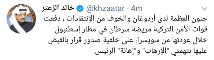 وكتب الزعتر، في تغريدة له عبر موقع التواصل الاجتماعي تويتر، تابعها المشهد العربي: "جنون العظمة لدى أردوغان والخوف من الانتقادات، دفعت قوات الأمن التركية إلى القبض على مريضة سرطان في مطار إسطنبول خلال عودتها من سويسرا، على خلفية صدور قرار بالقبض عليها بتهمتي "الإرهاب" و"إهانة" الرئيس".