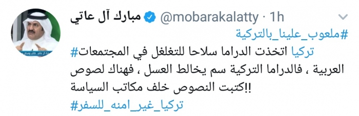 وكتب آل عاتي، في تغريدة له عبر موقع التواصل الاجتماعي تويتر، تابعها المشهد العربي: "تركيا اتخذت الدراما سلاحا للتغلغل في المجتمعات العربية، فالدراما التركية سم يخالط العسل".