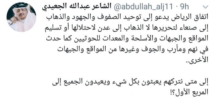 وكتب الجعيدي، في تغريدة له عبر موقع التواصل الاجتماعي تويتر، تابعها المشهد العربي: "اتفاق الرياض يدعو إلى توحيد الصفوف والجهود والذهاب إلى صنعاء لتحريرها لا الذهاب إلى عدن لاحتلالها أو تسليم المواقع والجبهات والأسلحة والمعدات للحوثيين كما حدث في نهم ومأرب والجوف وغيرها من المواقع والجبهات الأخرى".