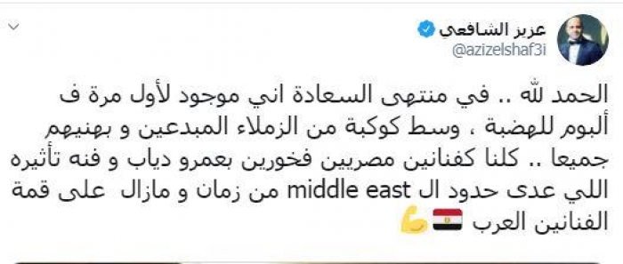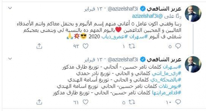 احتفل الملحن عزيز الشافعي، عبر حسابه الرسمي بموقع تويتر، بألبوم "سهران"، للفنان الكبير عمرو دياب.