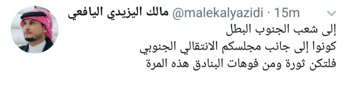 وكتب اليافعي، في تغريدة له على موقع التواصل الاجتماعي تويتر، تابعها المشهد العربي: "إلى شعب الجنوب البطل، كونوا إلى جانب مجلسكم الانتقالي الجنوبي".