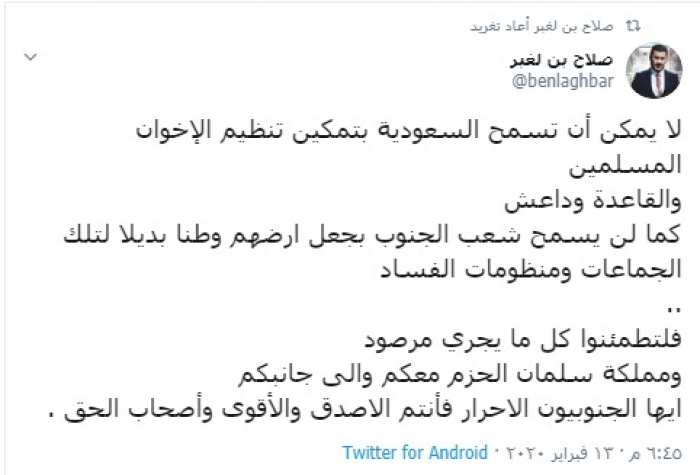 وكتب "بن لغبر" في تغريدة عبر تويتر، رصدها "المشهد العربي": "لا يمكن أن تسمح السعودية بتمكين تنظيم الإخوان المسلمين والقاعدة وداعش".