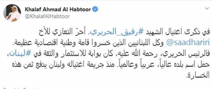 علق رجل الأعمال الإماراتي خلف الحبتور، اليوم، على الذكرى الـ 20 لاغتيال رئيس الوزراء اللبناني الأسبق رفيق الحريري.