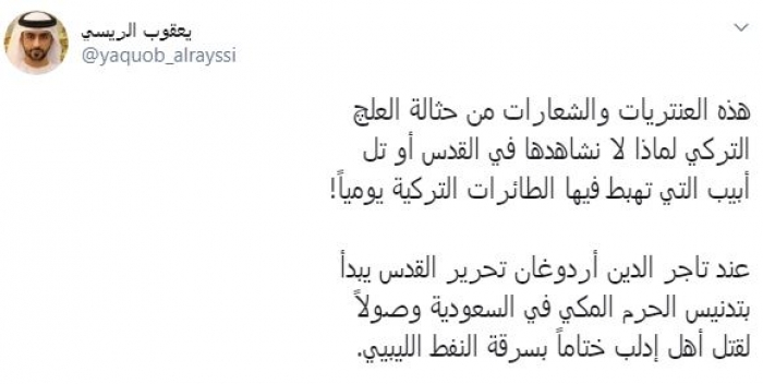 وقال في تغريدة عبر "تويتر" رصدها "المشهد العربي": "هذه العنتريات والشعارات من حثالة .... التركي لماذا لا نشاهدها في القدس أو تل أبيب التي تهبط فيها الطائرات التركية يومياً".