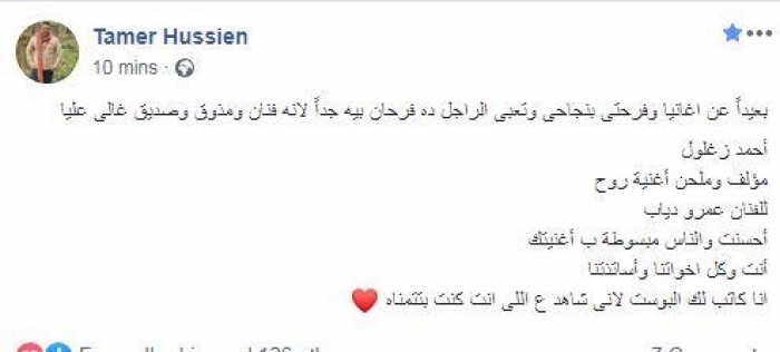 نشر الشاعر الغنائي تامر حسين عبر حسابه الشخصي بموقع "فيس بوك"، تدوينة يوجه بها رسالة لأحمد زغلول مدير أعمال عمرو دياب.