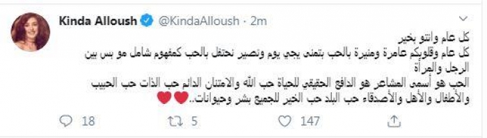 وكتبت كندة، عبر حسابها على "تويتر"، قائلة: "كل عام وإنتوا بخير.. كل عام وقلوبكم عامرة ومنيرة بالحب، بتمنى يجي يوم ونصير نحتفل بالحب كمفهوم شامل، مو بس بين الرجل والمرأة.. الحب هو أسمى المشاعر، هو الدافع الحقيقي للحياة، حب الله والامتنان الدائم، حب الذات، حب الحبيب والأطفال والأهل والأصدقاء، حب البلد، حب الخير للجميع بشر وحيوانات".