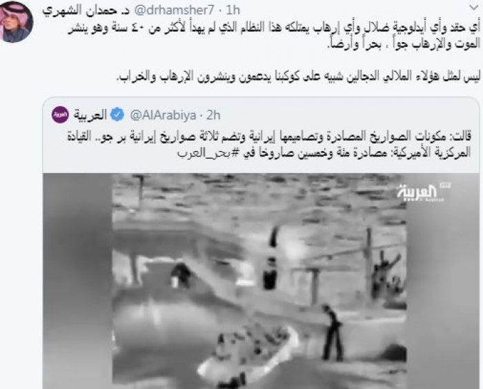 وقال في تغريدة عبر "تويتر" رصدها "المشهد العربي": "أي حقد وأي أيدلوجية ضلال وأي إرهاب يمتلكه هذا النظام الذي لم يهدأ لأكثر من ٤٠ سنة وهو ينشر الموت والإرهاب جواً، بحراً وأرضاً. ليس لمثل هؤلاء الملالي الدجالين شبيه على كوكبنا يدعمون وينشرون الإرهاب والخراب".