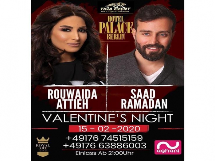 كما يحيي المطرب اللبناني سعد رمضان، والمطربة السورية رويدا عطية، حفل عيد الحب، في العاصمة الألمانية برلين السبت 15 فبراير.
