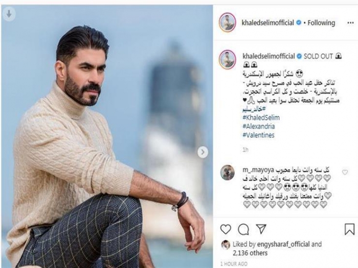 ويحتفل خالد سليم مع جمهوره بحفل عيد الحب في مسرح سيد درويش بالإسكندرية، ونشر سليم عبر حسابه الشخصي بموقع "إنستجرام": "شكرًا لجمهور الإسكندرية.. تذاكر حفل عيد الحب في مسرح سيد درويش بالإسكندرية..خلصت، وكل الكراسي اتحجزت، مستنيكم يوم الجمعة نحتفل سوا بعيد الحب".