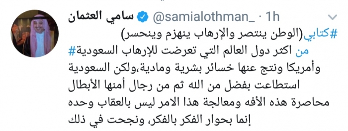 وكتب العثمان، في تغريدة له عبر موقع التواصل الاجتماعي تويتر، تابعها المشهد العربي: "من أكثر دول العالم التي تعرضت للإرهاب السعودية وأمريكا ونتج عنها خسائر بشرية ومادية".