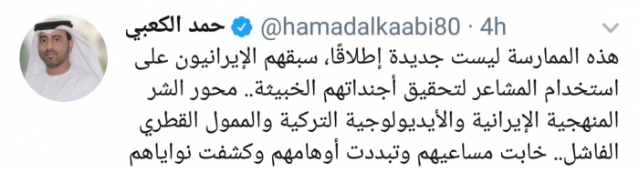 وكتب الكعبي، في تغريدة له عبر موقع التواصل الاجتماعي تويتر، تابعها المشهد العربي: "هذه الممارسة ليست جديدة إطلاقًا، سبقهم الإيرانيون على استخدام المشاعر لتحقيق أجنداتهم الخبيثة".