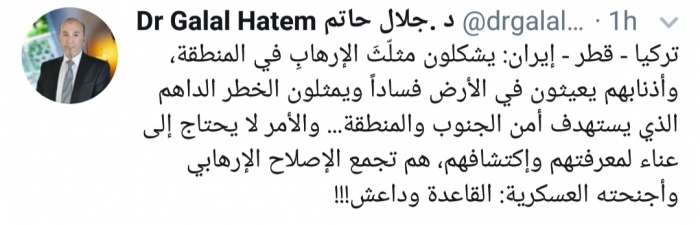 وكتب حاتم، في تغريدة له عبر موقع التواصل الاجتماعي تويتر، تابعها المشهد العربي: "تركيا وقطر وإيران يشكلون مثلّثَ الإرهابِ في المنطقة، وأذنابهم يعيثون في الأرض فساداً ويمثلون الخطر الداهم الذي يستهدف أمن الجنوب والمنطقة".