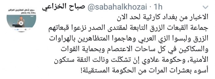 وكتب الخزاعي، في تغريدة له عبر موقع التواصل الاجتماعي تويتر، تابعها المشهد العربي: "الأخبار من بغداد كارثية لحد الآن.. جماعة القبعات الزرق التابعة لمقتدى الصدر نزعوا قبعاتهم الزرق ولبسوا الزي العربي وهاجموا المتظاهرين بالهراوات والسكاكين في كل ساحات الاعتصام وبحماية القوات الأمنية".