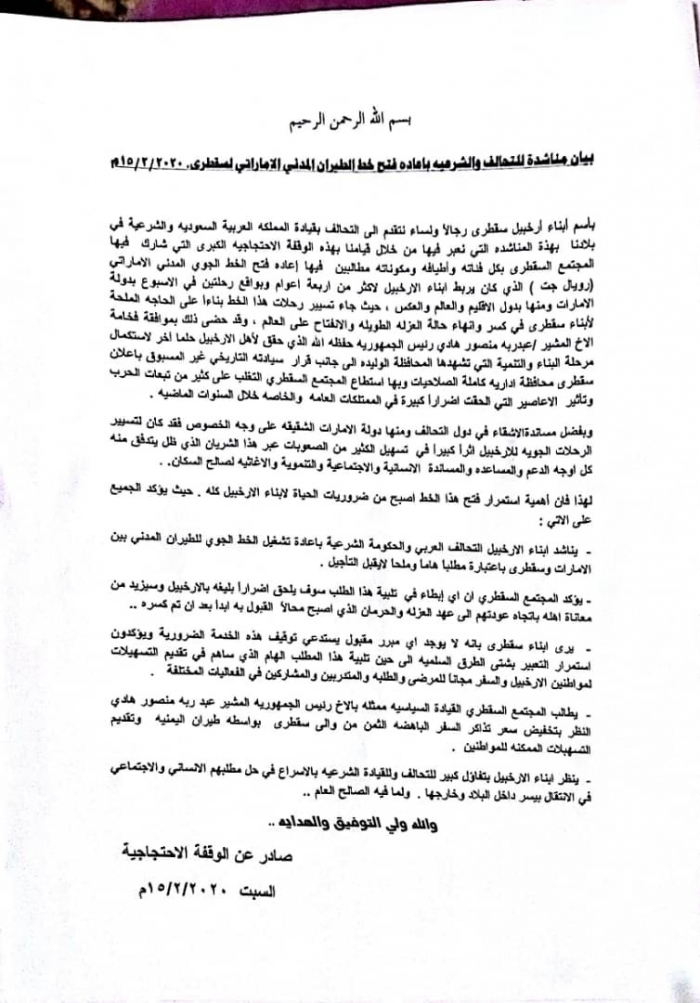 وناشد المشاركون في الفعاليات خلال البيان الختامي، التحالف العربي بإعادة تشغيل الخط الجوي للطيران المدني بين الإمارات وسقطرى.