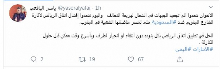 وقال في تغريدة عبر "تويتر" رصدها "المشهد العربي": "الإخوان عمدوا إلى تجميد الجبهات في الشمال لهزيمة التحالف واليوم تعمدوا إفشال اتفاق الرياض لإثارة الشارع الجنوبي ضد السعودية حتى تخسر حاضنتها الشعبية في الجنوب".