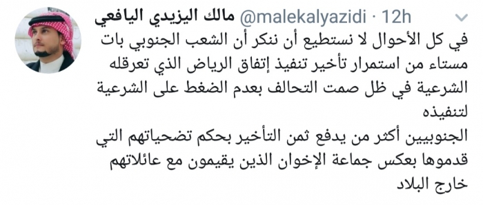 أكد الناشط السياسي مالك اليزيدي اليافعي، أن أبناء الجنوب هم من يدفع ثمن تأخير تنفيذ اتفاق الرياض.