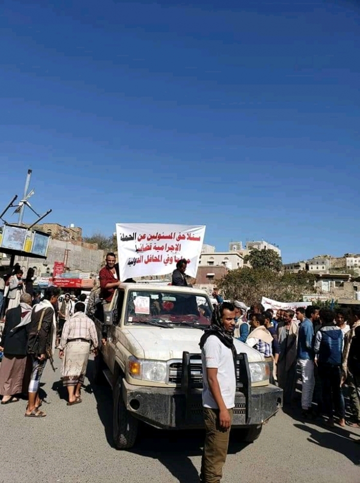 ودعا السكان مؤسسات المجتمع المدني والمنظمات الدولية إلى توثيق الانتهاكات التي طالتهم من مليشيات الإخوان الإرهابية التابعة لحكومة الشرعية، والعصابات المتحكمة بزمام الأمور في المحافظة.