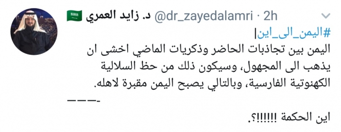 وكتب العمري، في تغريدة له عبر موقع التواصل الاجتماعي تويتر، تابعها المشهد العربي: "بين تجاذبات الحاضر وذكريات الماضي أخشى أن يذهب إلى المجهول، وسيكون ذلك من حظ السلالية الكهنوتية الفارسية، وبالتالي يصبح اليمن مقبرة لأهله"، متساءلا: "أين الحكمة؟".