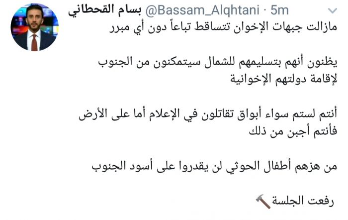 وكتب القحطاني، في تغريدة له عبر موقع التواصل الاجتماعي تويتر، تابعها المشهد العربي: "مازالت جبهات الإخوان تتساقط تباعاً دون أي مبرر".