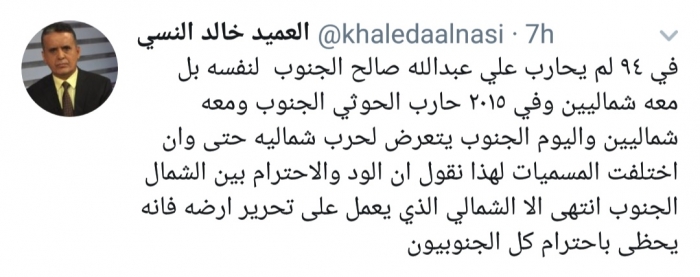 وكتب النسي، في تغريدة له عبر موقع التواصل الاجتماعي تويتر، تابعها المشهد العربي: "في ٩٤ لم يحارب علي عبدالله صالح الجنوب لنفسه بل معه شماليين".