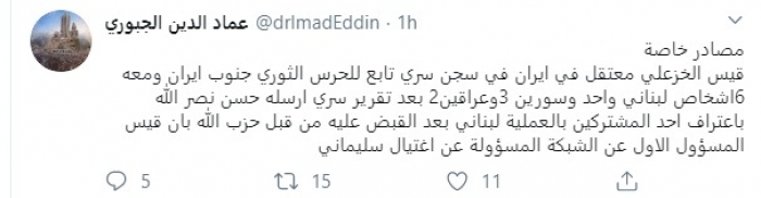وقال في تغريدة عبر "تويتر" رصدها "المشهد العربي": "مصادر خاصة قيس الخزعلي معتقل في إيران في سجن سري تابع للحرس الثوري جنوب إيران ومعه 6 أشخاص لبناني واحد وسوريين 3 وعراقيين 2 بعد تقرير سري أرسله حسن نصر الله باعتراف أحد المشتركين بالعملية لبناني بعد القبض عليه من قبل حزب الله بأن قيس المسؤول الأول عن الشبكة المسؤولة عن اغتيال سليماني".