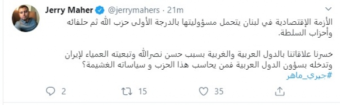 وكتب في تغريدة عبر "تويتر" رصدها "المشهد العربي": " الأزمة الإقتصادية في لبنان يتحمل مسؤوليتها بالدرجة الأولى حزب الله ثم حلفائه وأحزاب السلطة. خسرنا علاقاتنا بالدول العربية والغربية بسبب حسن نصرالله وتبعيته العمياء لإيران وتدخله بشؤون الدول العربية فمن يحاسب هذا الحزب وسياساته الغشيمة؟".