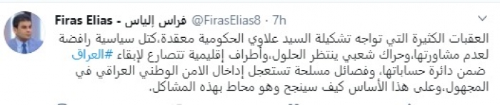 وقال في تغريدة عبر "تويتر" رصدها "المشهد العربي": "العقبات الكثيرة التي تواجه تشكيلة السيد علاوي الحكومية معقدة، كتل سياسية رافضة لعدم مشاورتها، وحراك شعبي ينتظر الحلول، وأطراف إقليمية تتصارع لإبقاء العراق ضمن دائرة حساباتها، وفصائل مسلحة تستعجل إدخال الأمن الوطني العراقي في المجهول، وعلى هذا الأساس كيف سينجح وهو محاط بهذه المشاكل".