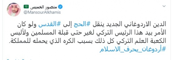 وقال في تغريدة عبر "تويتر" رصدها "المشهد العربي": "الدين الأردوغاني الجديد ينقل الحج إلى القدس ولو كان الأمر بيد هذا الرئيس التركي لغير حتى قبلة المسلمين ولألبس الكعبة العلم التركي كل ذلك بسبب الكره الذي يحمله للمملكة. أردوغان يحرف الإسلام".