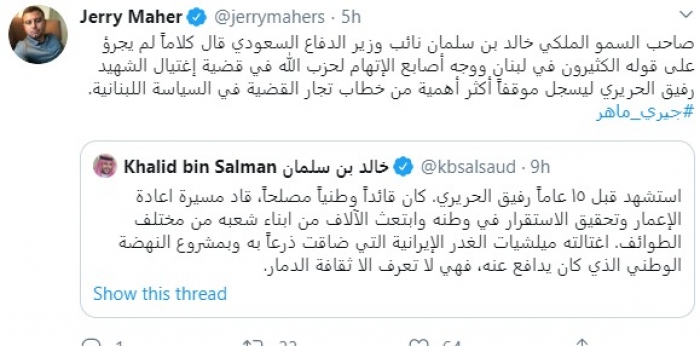 علق الكاتب الصحفي اللبناني جيري ماهر، اليوم، على تصريحات نائب وزير الدفاع السعودي الأمير خالد بن سلمان، بشأن اغتيال رفيق الحريري.