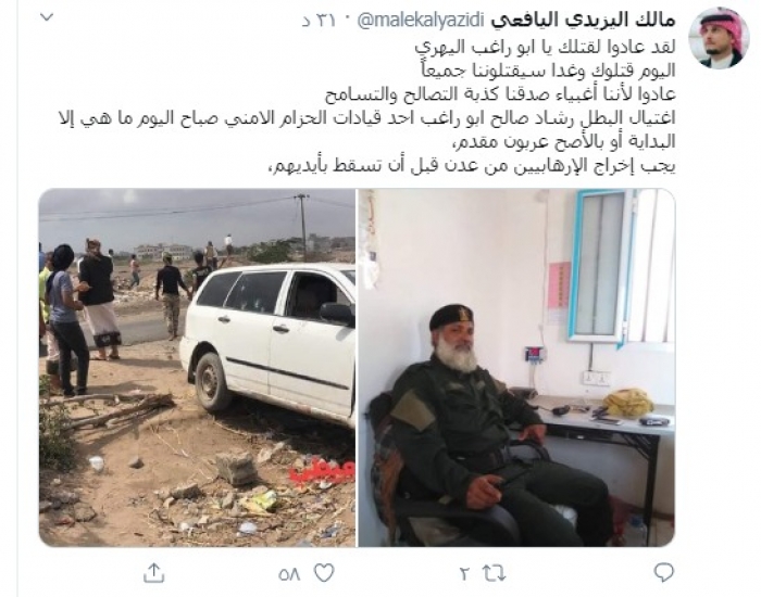 وقال في تغريدة عبر "تويتر" رصدها "المشهد العربي": "لقد عادوا لقتلك يا ابو راغب اليهري اليوم قتلوك وغدا سيقتلوننا جميعاً عادوا لأننا أغبياء صدقنا كذبة التصالح والتسامح اغتيال البطل رشاد صالح أبو راغب أحد قيادات الحزام الأمني صباح اليوم ما هي إلا البداية أو بالأصح عربون مقدم، يجب إخراج الإرهابيين من عدن قبل أن تسقط بأيديهم".