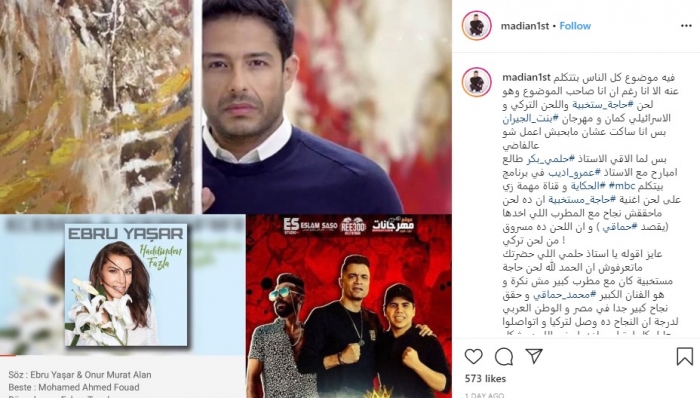 وعلق مدين على الصورة: "فيه موضوع كل الناس بتتكلم عنه إلا أنا رغم أن أنا صاحب الموضوع وهو لحن (حاجة مستخبية)، واللحن التركي والإسرائيلي كمان ومهرجان (بنت الجيران)، بس أنا ساكت عشان ما بحبش أعمل شو عالفاضي".