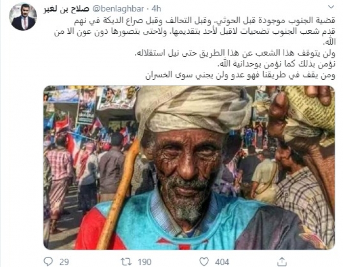 وكتب في تغريدة عبر "تويتر" رصدها "المشهد العربي": "قضية الجنوب موجودة قبل الحوثي، وقبل التحالف وقبل صراع الديكة في نهم قدم شعب الجنوب تضحيات لاقبل لأحد بتقديمها، ولا حتى بتصورها دون عون إلا من الله".