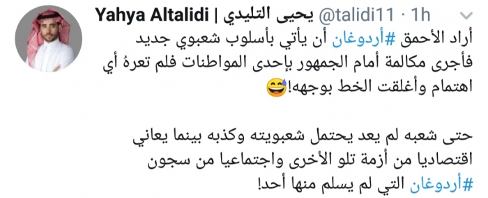 وكتب التليدي، في تغريدة له عبر موقع التواصل الاجتماعي تويتر، تابعها المشهد العربي: "أراد الأحمق أردوغان أن يأتي بأسلوب شعبوي جديد فأجرى مكالمة أمام الجمهور بإحدى المواطنات فلم تعرهُ أي اهتمام وأغلقت الخط بوجهه".