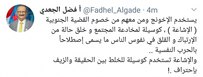 وكتب الجعدي، في تغريدة له عبر موقع التواصل الاجتماعي تويتر، تابعها المشهد العربي: "يستخدم الإخونج ومن معهم من خصوم القضية الجنوبية الإشاعة، كوسيلة لمخادعة المجتمع وخلق حالة من الإرتباك والقلق في نفوس الناس ما يسمى إصطلاحاً بالحرب النفسية".