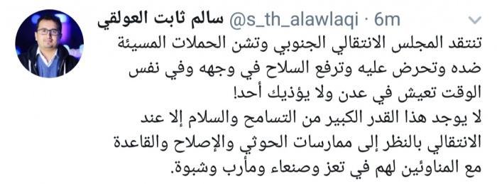 وتابع: "لا يوجد هذا القدر الكبير من التسامح والسلام إلا عند الانتقالي بالنظر إلى ممارسات الحوثي والإصلاح والقاعدة مع المناوئين لهم في تعز وصنعاء ومأرب وشبوة".