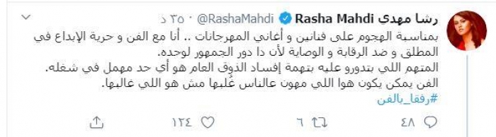 نشرت الفنانة رشا مهدي عبر حسابها الشخصي بموقع "تويتر" تغريدة تتحدث بها عن أغاني المهرجانات والأزمة الدائررة حاليًا في مصر.