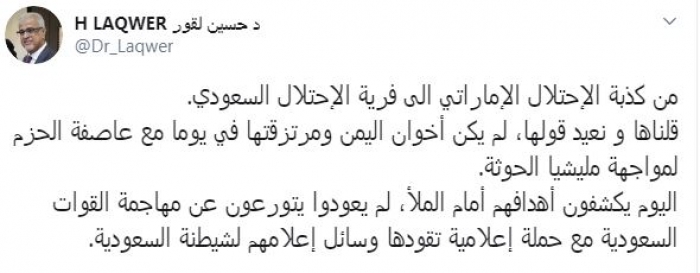 وكتب في تغريدة عبر "تويتر" رصدها "المشهد العربي": "من كذبة الاحتلال الإماراتي الى فرية الاحتلال السعودي. قلناها ونعيد قولها، لم يكن إخوان اليمن ومرتزقتها في يوما مع عاصفة الحزم لمواجهة مليشيا الحوثة. اليوم يكشفون أهدافهم أمام الملأ، لم يعودوا يتورعون عن مهاجمة القوات السعودية مع حملة إعلامية تقودها وسائل إعلامهم لشيطنة السعودية".