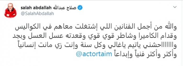 ونشر عبدالله، مشهد يجمعه مع تيم من مسلسل "عائلة الحاج نعمان"، عبر حسابه في "تويتر"، وعلق: "والله من أجمل الفنانين اللي اشتغلت معاهم في الكواليس وقدام الكاميرا، وشاطر قوي قوي، وقعدته عسل العسل، وبجد واحشني يا تيم يا غالي، وكل سنة وانت زي ما أنت إنسانيًا وأكتر وأكتر فنًا وإبداعاً".
